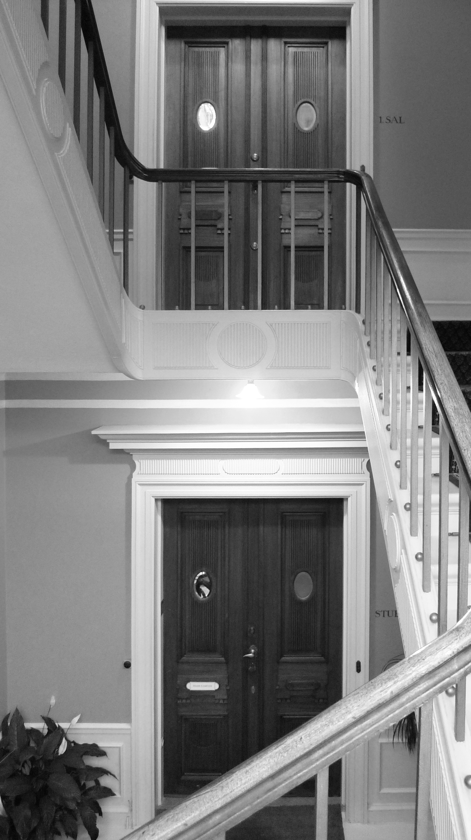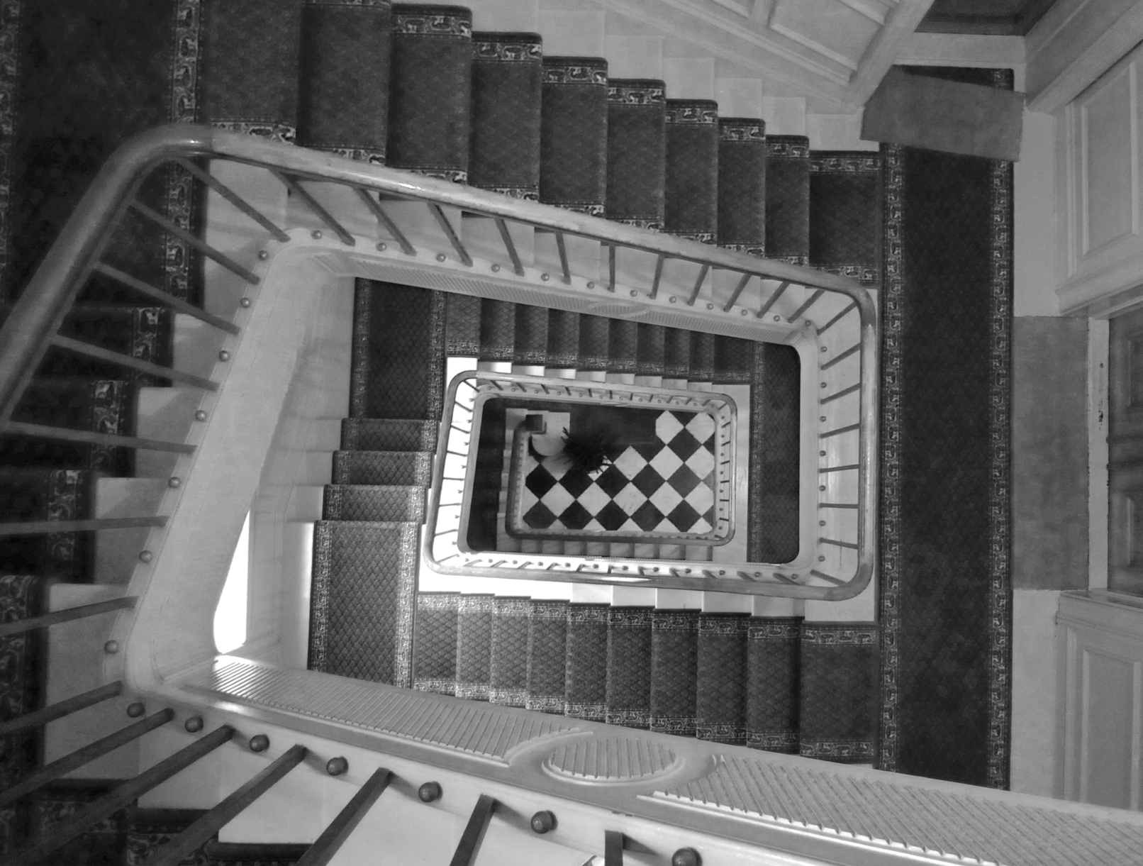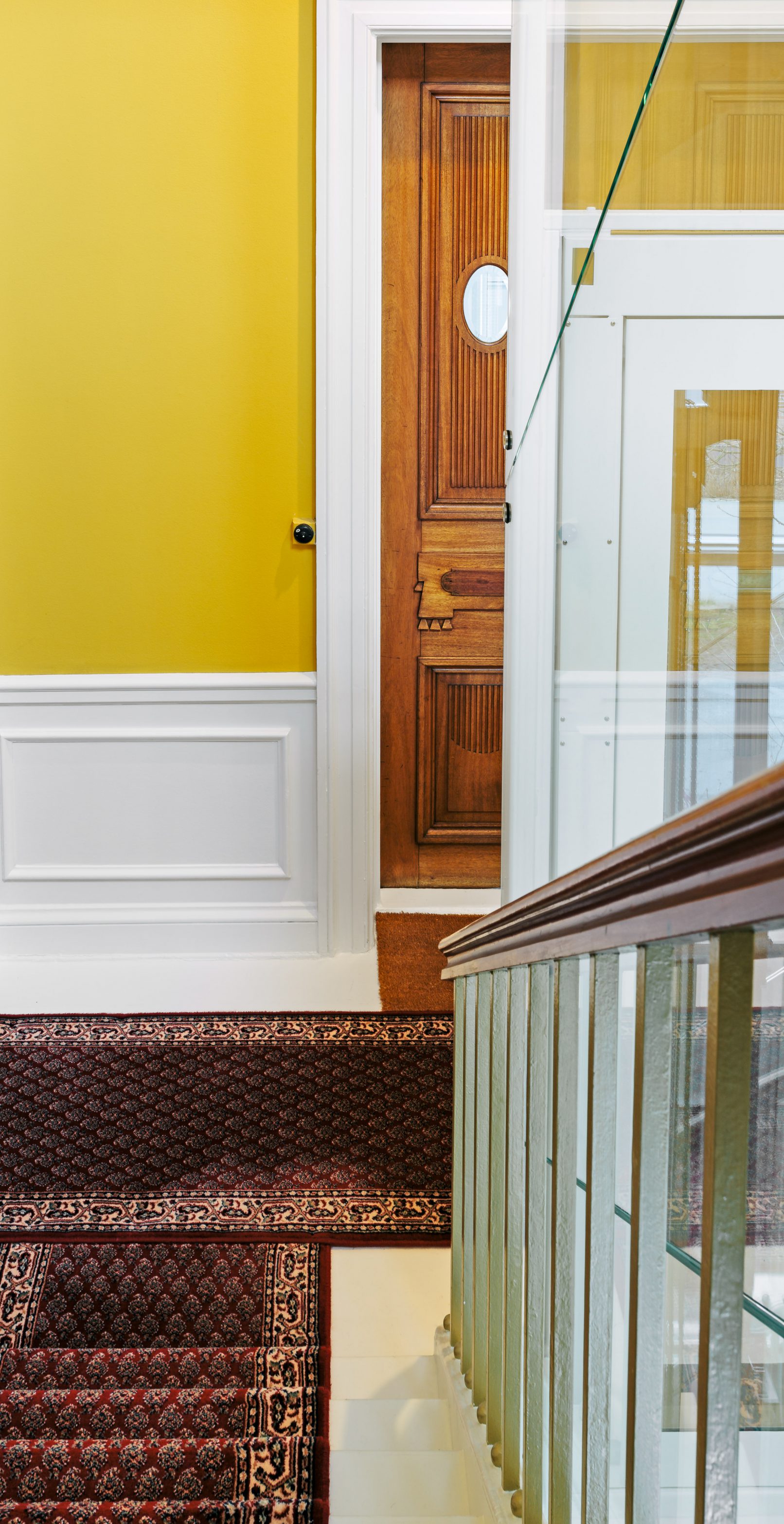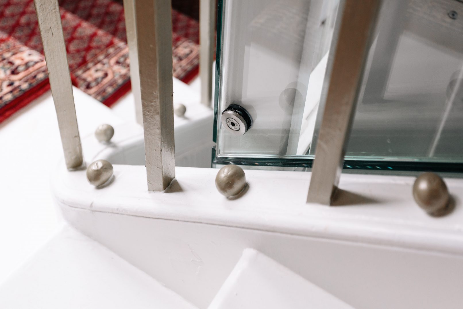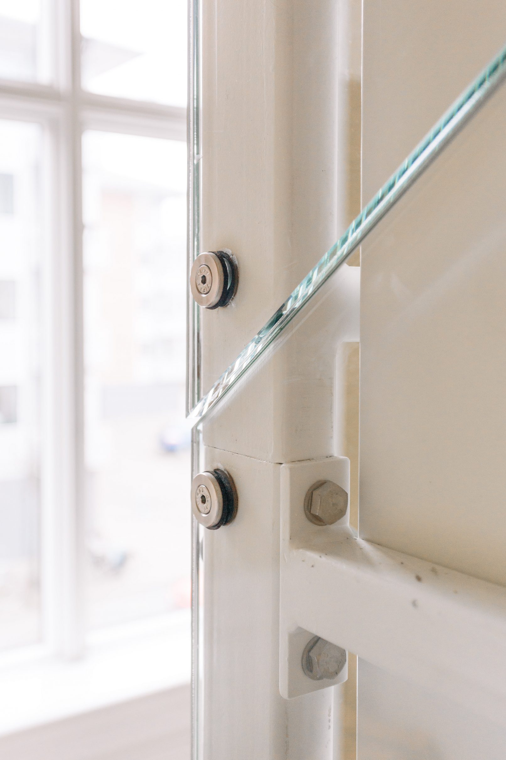 Tilpasninger til trappens skævheder og gelændre, samt friholdelse fra vangerne giver et integreret og luftigt indtryk.