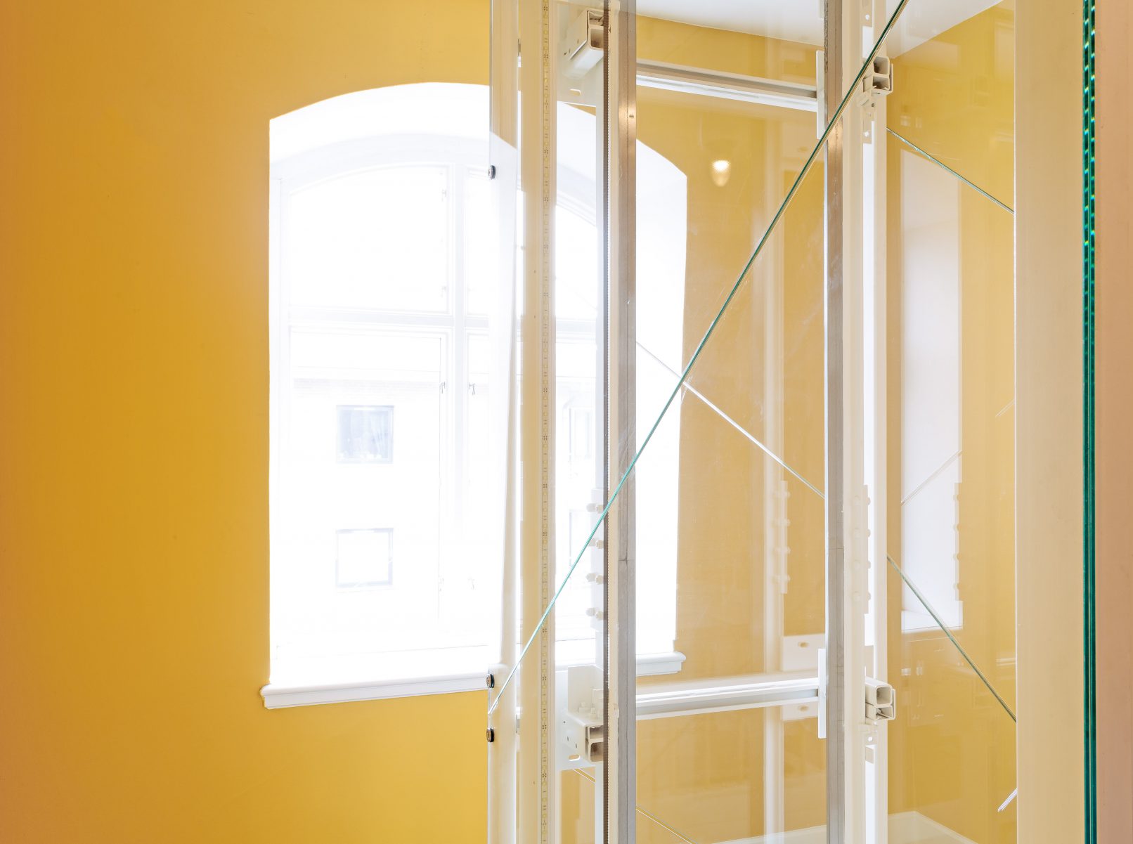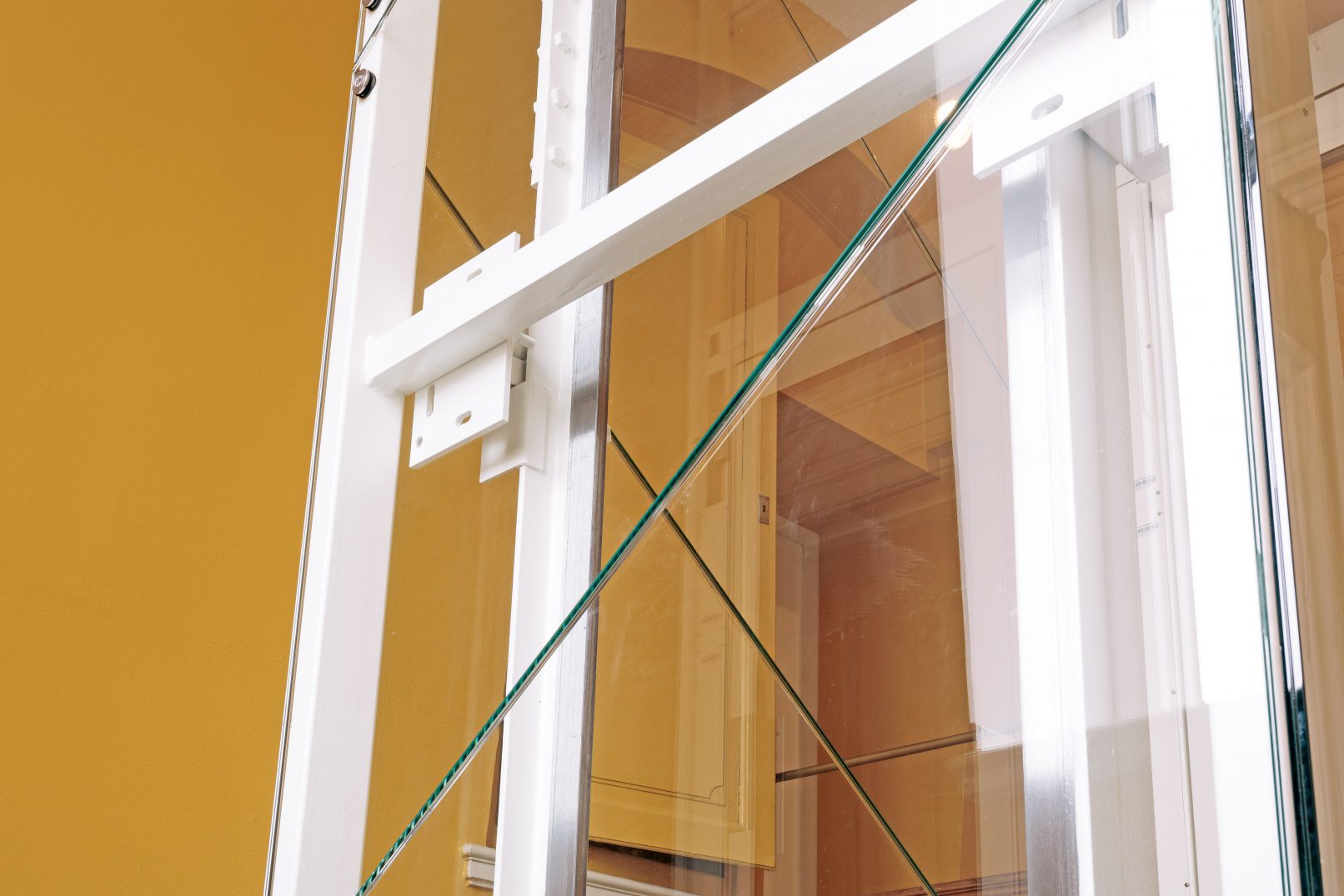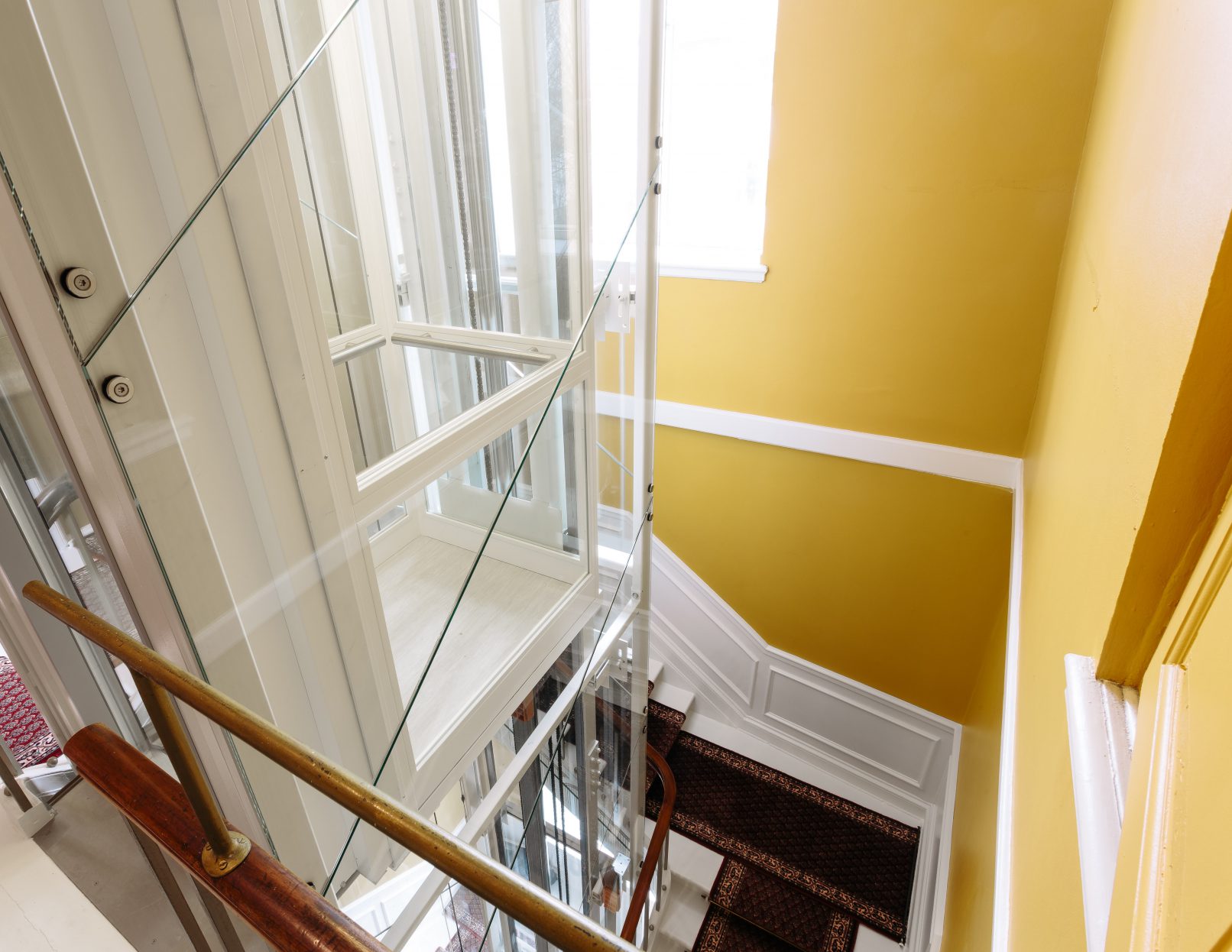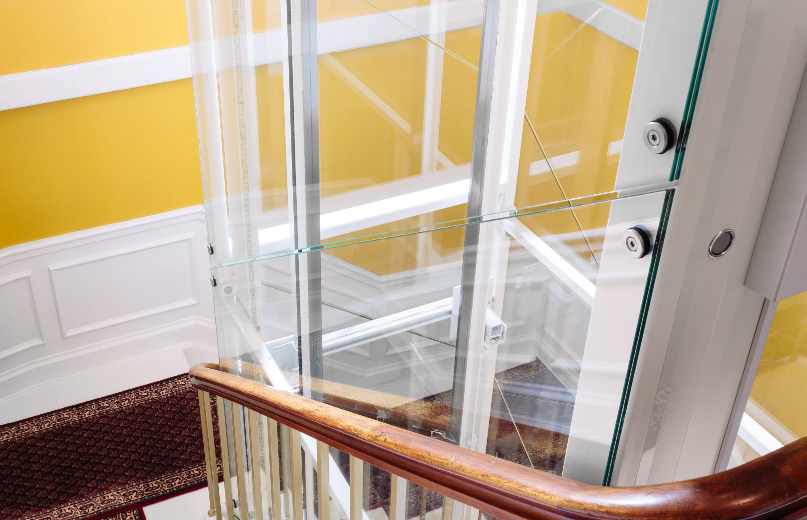 Ønsket om at få en æstetisk indpasset elevator i denne fine trappeopgangs durchsicht er indfriet med denne fritstående transparente glasløsning.