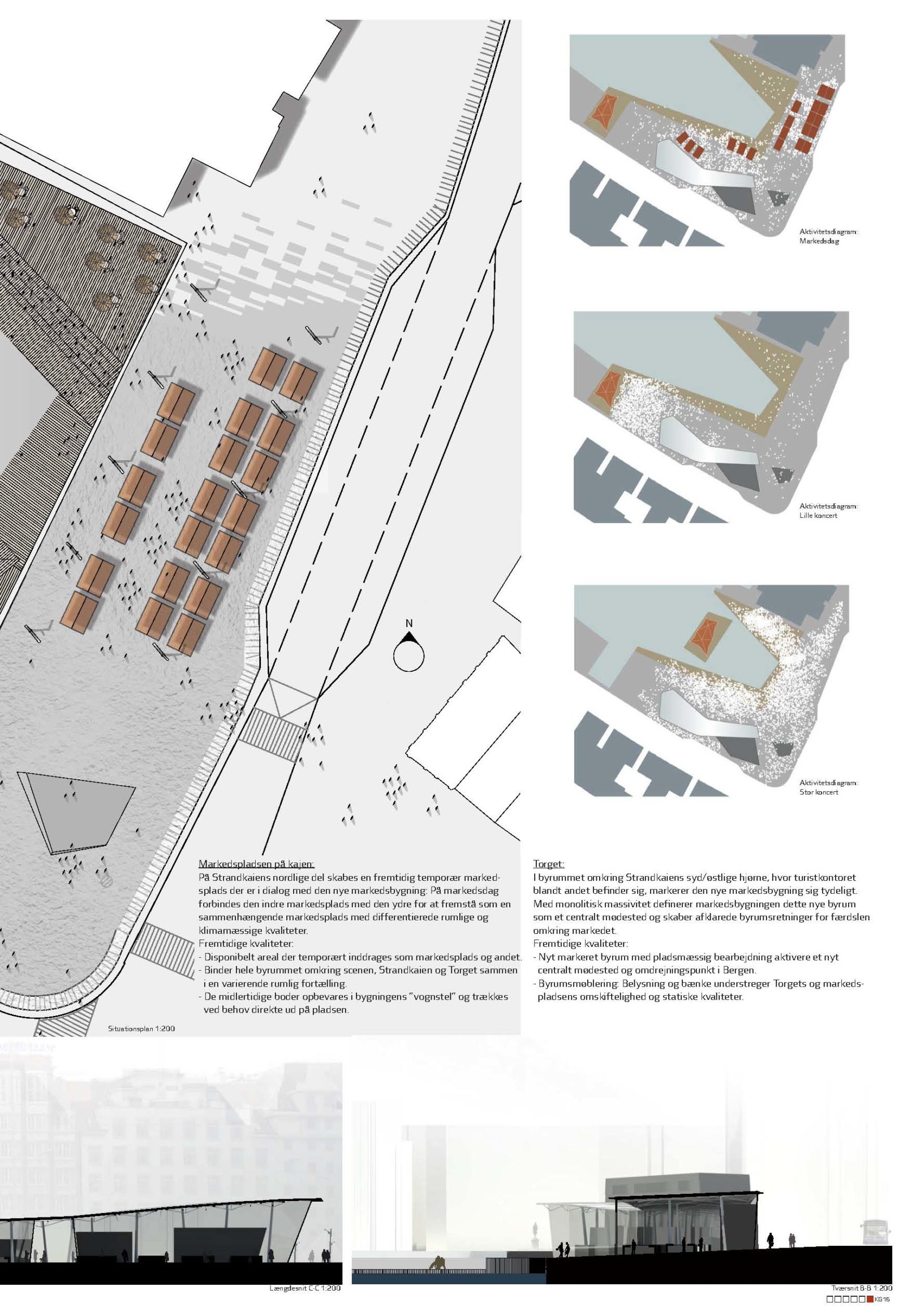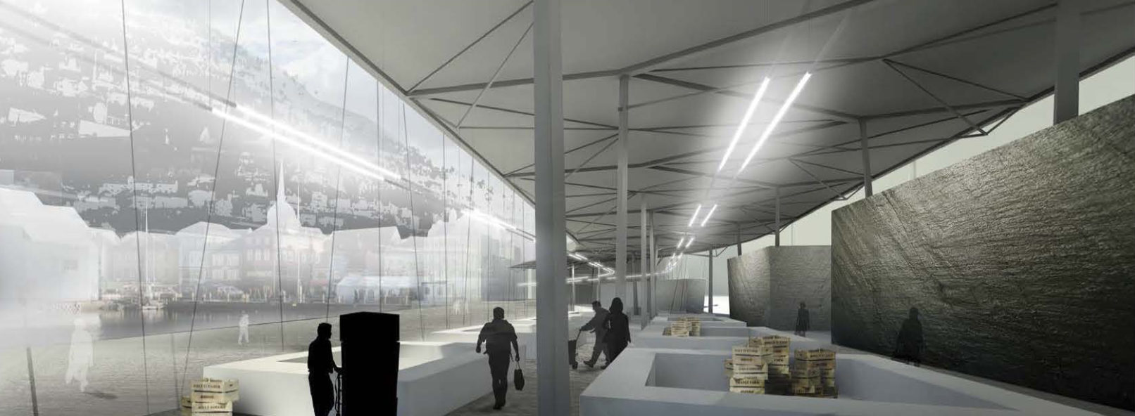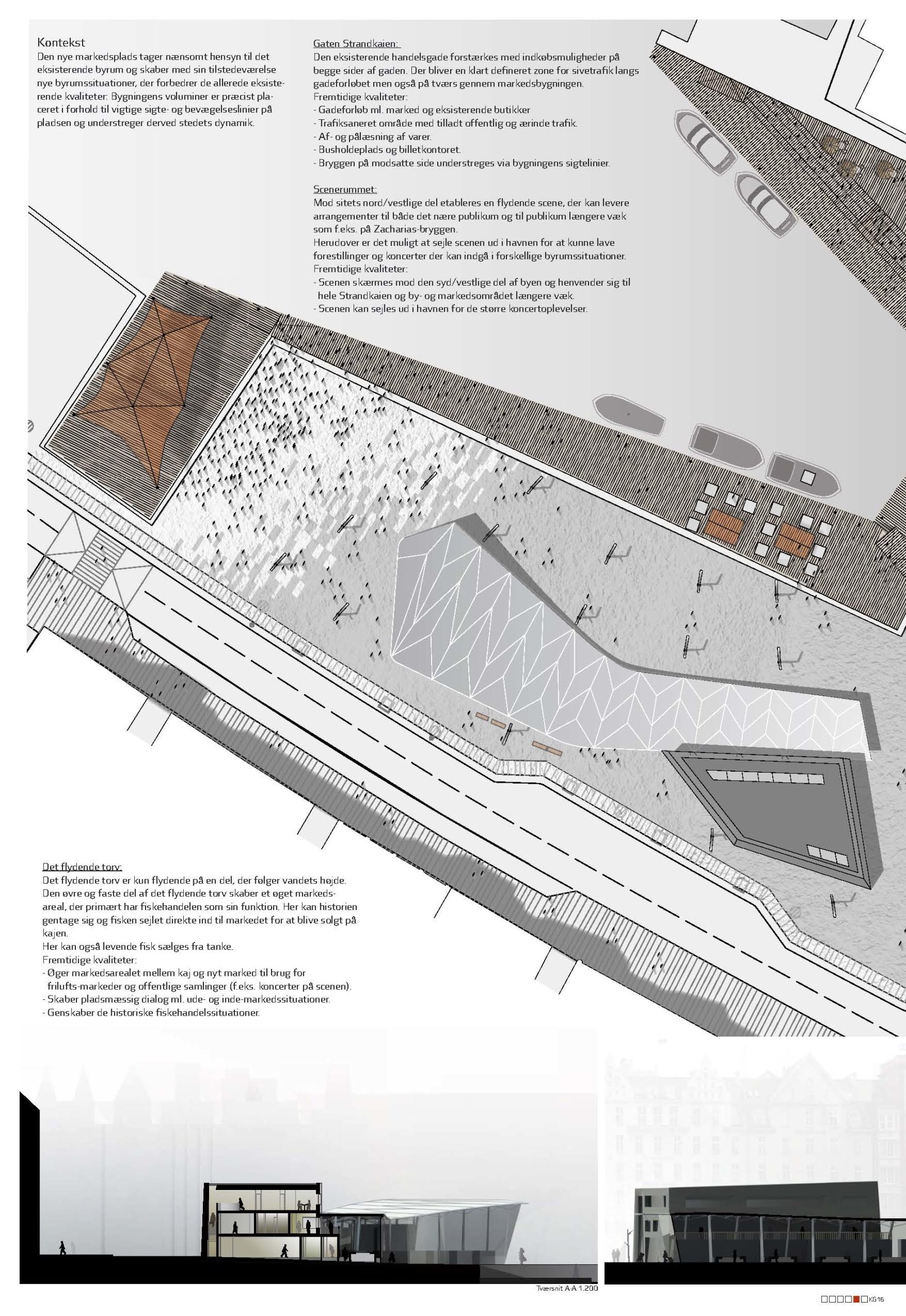 Naturens fænomener og nære tilstedeværelse gengives i den nye markedsplads som en rumlig leg med det massive og det åbne. Servicearealernes skiferbeklædte volumener, indretter landskabeligt Strandkaien med de nødvendige funktioner og sikrer optimal brug af markedet samt de omgivende byrum.