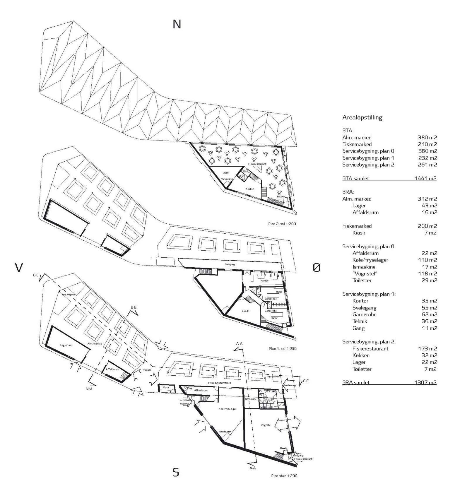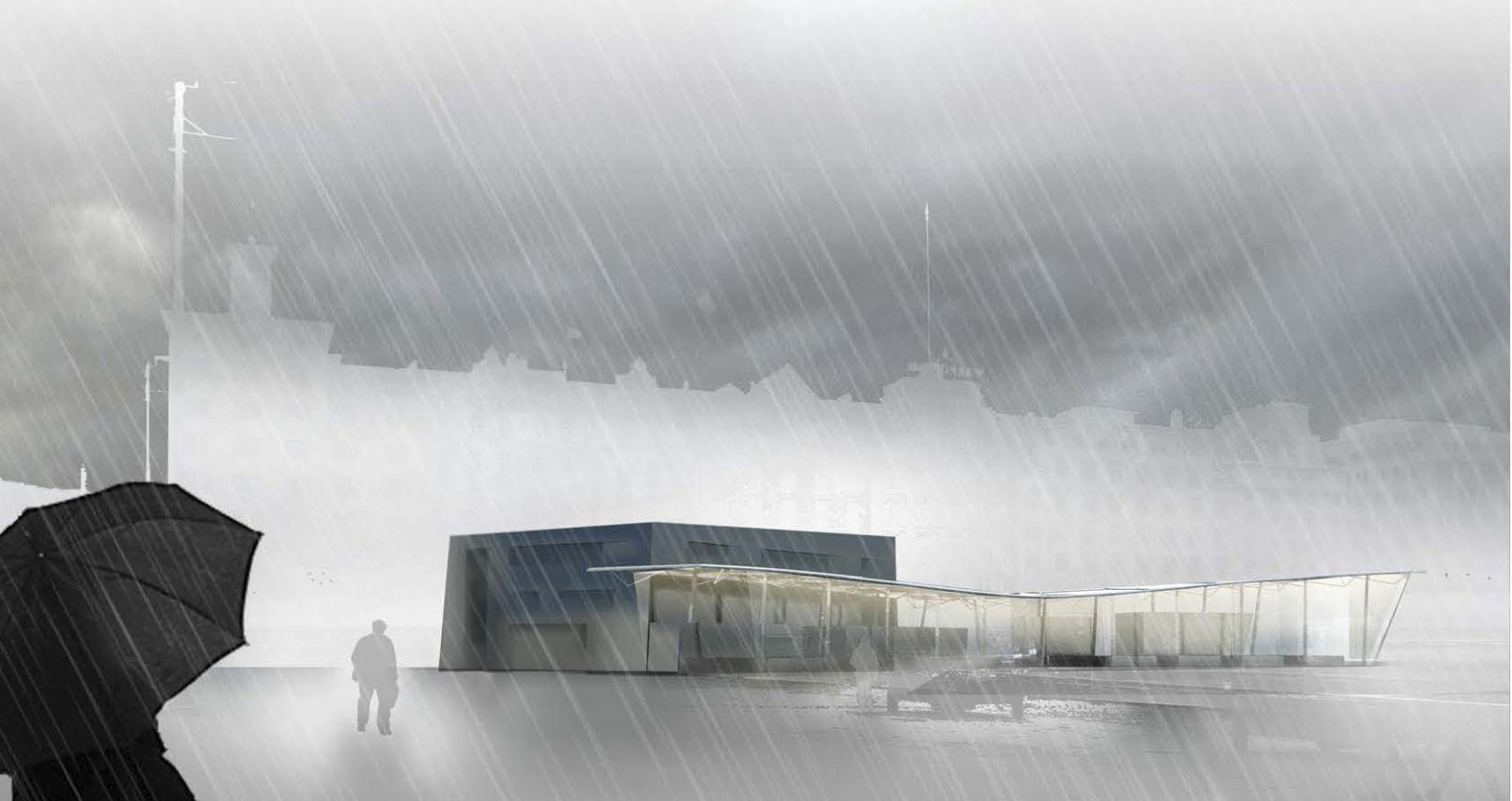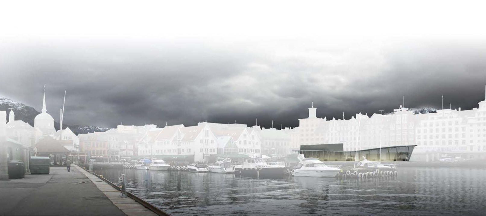 Naturens fænomener og nære tilstedeværelse gengives i den nye markedsplads som en rumlig leg med det massive og det åbne. Servicearealernes skiferbeklædte volumener, indretter landskabeligt Strandkaien med de nødvendige funktioner og sikrer optimal brug af markedet samt de omgivende byrum.